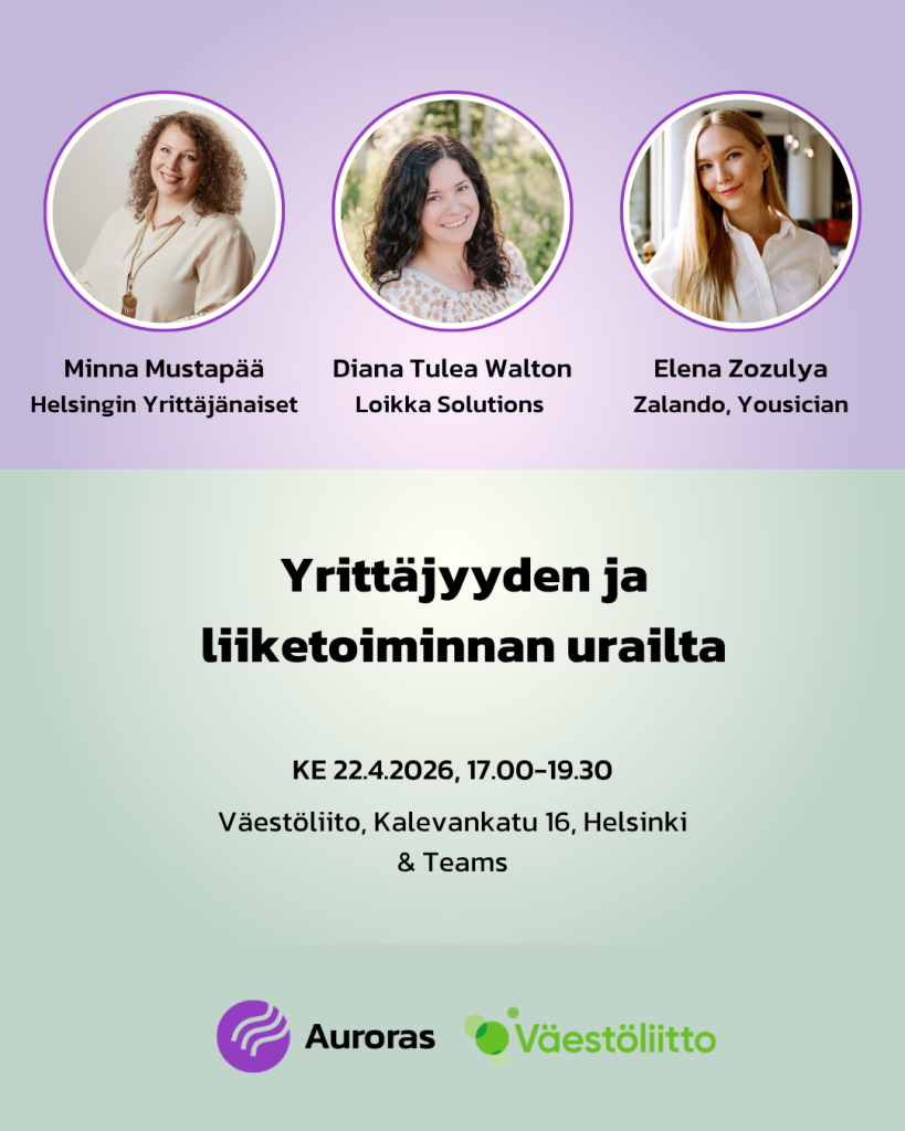 Millaisia mahdollisuuksia yrittäjyys ja liiketoiminta voivat avata urallesi Suomessa? Mihin suuntaan haluaisit viedä omaa liikeideaasi tai liiketoiminnan polkuasi? Tervetuloa Auroras-verkoston ja Womenton Yrittäjyyden ja liiketoiminnan urailtaan!